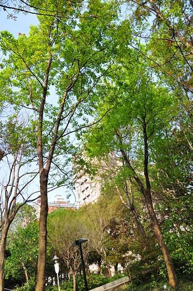 經過短暫的休眠,原本崢嶸指向天際的枝椏間開始出現了粉嫩的新綠,今年立春過後,這個區域裡的大小樹木陸續換上新裝,向繁忙的都會人們宣告春天的來臨。
