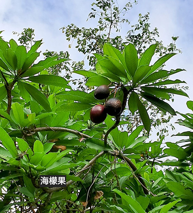油桐花(Aleurites montana (Lour.) Wils.)是引進的外來種植物,植物園正盛開的大白花卻是臺灣道地的原生植物。這是生長在海邊的海檬果,屬於熱帶海漂植物,果實內含有纖維層,可以隨著洋流漂流至遠方。