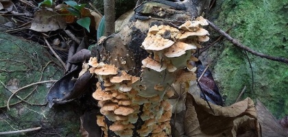 尋寶指南與安全警告:在低海拔山坡地或都市公園中,尋找葉片突然變黃、枯萎的樹木,觀察其靠近地面的根頸部是否有深褐色的泥沙狀菌膜(即俗稱的「棕色襪子」)。有害木層孔菌會造成樹木根基腐爛導致支撐力喪失,受感染的樹木隨時有無預警倒伏的危險,觀察時請務必與樹木保持安全距離。