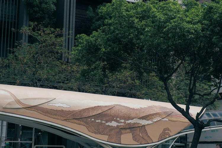 候車亭外觀彩繪的三角龍、伶盜龍、暴龍、竊蛋龍、圓頂龍、真板頭龍6隻都是「恐龍廳」熱門主角,科博館邀請臺中在地、揚名國際的藝術家鄒駿昇合作,畫風細膩的他,以低飽和色調、復古繪圖風格詮釋,讓人眼睛為之一亮。
