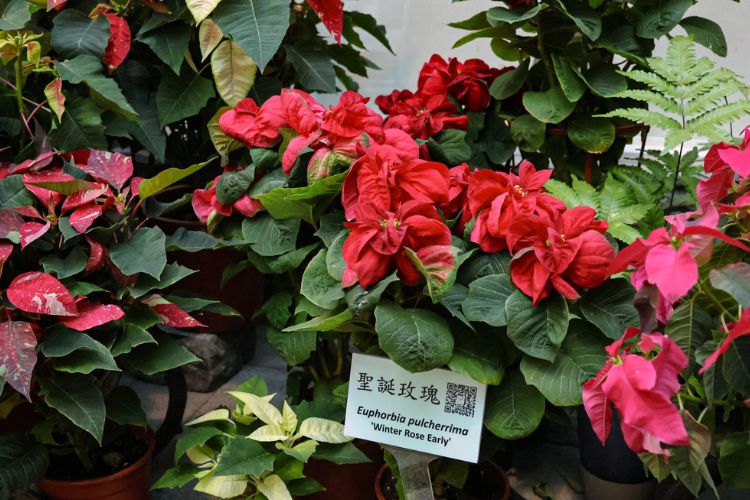 這次植物園一共展出14種、600盆聖誕紅植栽,有經典紅色苞片的「聖誕節」、淡粉色苞片鑲嵌白色斑紋的「斑葉粉紅公主」,正白色的「純白」,紅色帶白斑的「冰火」、紅色散佈米黃色斑點的「星鑽」聖誕紅等品種,其中還有2種亮黃色的「金月」、「檸檬聖誕」,相當吸睛,也特別感謝陽昇園藝有限公司、永松園藝、谷得園藝有限公司協助提供聖誕紅盆花。