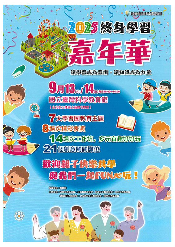 活動簡介:活動免費參觀,以「讓學習成為習慣,讓知識成為力量」為主題,搭配終身教育學習圈7大教育主題,透過攤位遊戲互動、工作坊、舞臺表演等呈現,並規劃闖關集點活動,歡迎大、小朋友共襄盛舉。相關活動資訊亦可搜尋臉書專頁「終身學習聯盟」、「終身學習e起來」,及本部「教育基金會資訊網」活動查詢專區。