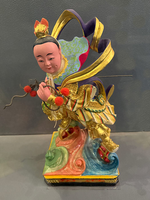 科博館「漢人的心靈生活」展廳有一尊腳踩風火輪的三太子哪吒。三太子哪吒神像的特色是童心未泯、活潑可愛的孩童形象,也是民俗信仰中兒童的保護神。腳踩風火輪展現其神速及機動性;手持乾坤圈和火尖槍兩樣法器是神力象徵。哪吒代表年輕人的勇敢、力量與正義,近年融入現代流行的電音三太子,表現熱血與創新,為台灣民俗文化注入新生命。