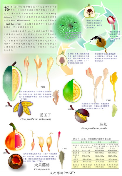 愛玉子、薛荔、大果藤榕標本來源大多為自己採集、並進行顯微觀察、拍照,再以電腦繪圖加以臨摹完成(page1-2);酵素化學反應圖片(page3)則參考自科展報告書、碩博士論文:其餘圖片有部分參考網路資料繪製。本作品的繪圖方式是完全以電腦繪圖方式完成,以CorelDraw X6進行向量繪製、上色,再以Photoshop CS6進行後製。