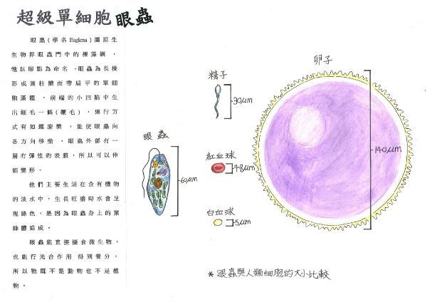 在國中生物課程裡,學到了五大界,裡面原生生物界中提到了眼蟲,老師講解時提到眼蟲既不為植物,也不為動物。他不同的習性使之與眾不同,成為獨立的一門。我感到很有趣又特別,所以選此為這次主題。