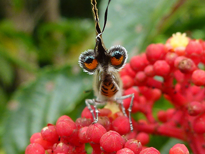 Many lycaenid butterflies have filamentous “tails” and eye-like markings on the ends of their wings. Such eyespots and tails mimic eyes and antennae, confusing their predators and increasing their chance of survival. While visiting flowers, these butterflies frequently move their hindwing tails to attract predators’ attention and make them believe they are looking at as head. In images 1 and 2, the hindwing tails and eyespots have apparently been attacked by a predator. Image 3 is an intact individual. Three individuals are all Deudorix epijarbas menesicles, photographed in the same location. Two of them show damaged eyespots, indicating the importance of mimicry in surviving predator attacks.