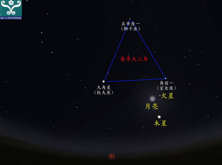 火星約在凌晨三、四點左右,木星在凌晨四、五點時出現在東方地平線上。因此在日出前才可以看到「火星、木星合月」(圖一)。這一天正值農曆二十七是下弦月,月亮像一道柳葉眉。雖然不是很壯觀,但是配合背景的「春季大三角」,不也是一幅美麗的星空!