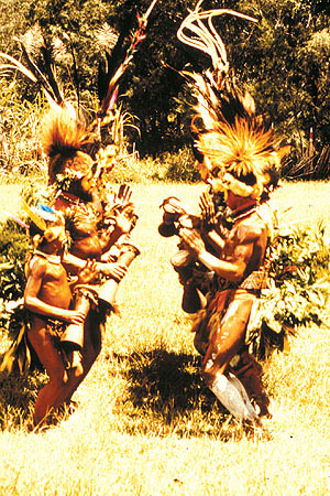 The New Guinean traditional ceremonies include those for birth, puberty, marriage, death and burial, basically ceremonies from birth to death. The annual ceremonies related to living activities and other shaman and memorial ceremonies are accompanied by singing, dancing and diverse social exchanges. People communicate with the spirit world through shamanism and ceremonies. They have developed unique presentations of art, including: woodcarving, stone carving, bone carving, seashell carving, drawing, instruments, bark paintings, pottery, architecture, weaving and human body decoration, etc.