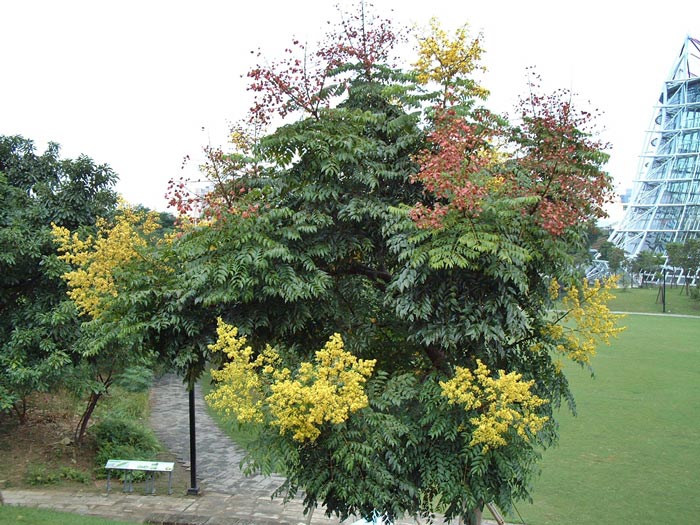 Flamegold is a beautiful native plant of Taiwan, found in the sunnyside broad-leaved forests at low elevations across the island. The change with seasons is distinct. In spring, fresh green leaves sprout from the bare branches, while in summer, the lush green foliage provides shade for passersby. As summer comes to an end, the tree is adorned with bright yellow flowers that create waves of dazzling golden blooms in the breeze, prompting people to gaze upward with admiration. Picking up a small flower that has fallen with the wind, one can observe that the tiny yellow flower, no larger than a fingernail, has a hint of red at its base, seemingly heralding the vibrant red of the next season. Once the yellow flowers have fallen, charming bright red fruits that resemble lanterns make their appearance. In late summer and early autumn, the simultaneous presence of green leaves, bright yellow flowers, and vivid red fruits creates a captivating landscape, marking the most beautiful time of the year for the Flamegold. As the fruits gradually change from bright red to reddish-brown, the leaves also shift to a golden hue. When the cold winter winds blow, the entire tree sways, shedding a carpet of golden leaves, leaving only the dark brown trunk standing proudly against the cold wind, waiting for the return of its splendor in the coming year.