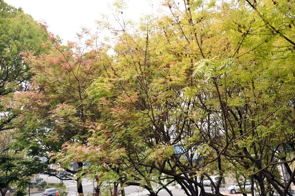 The main building area of the museum is connected to the Botanical Garden by Xitun Road, and on the side of Xitun Road that is near the Botanical Garden, the street trees are the Chinese pistache. The Chinese pistache is a dioecious, semi-deciduous tree. It may not shed all of its leaves due to low temperatures in autumn and winter, but when new buds sprout in spring, the old leaves will be renewed at the same time. Male flowers also emerge with the new leaves, and the pollen released during this time often covers the surfaces of vehicles parked under the tree with a thin layer of yellow powder. As the new buds develop, the male flowers gradually wither, which is why you can see withered yellow inflorescences mixed in with the new leaves.