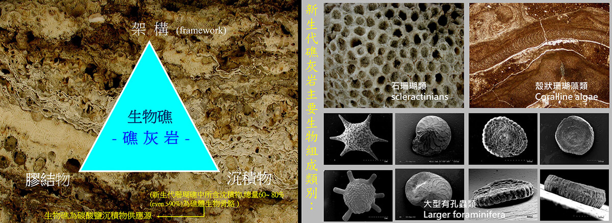 From a geological point of view, biotic reefs are topographical structural agglomerates constructed by living organisms. Therefore, the development of reefs must be able to withstand the destructive effects of winds, waves, and currents. From another perspective, reefs that can continue to develop make the best coastal breakwaters. In addition, as biotic reefs are mainly formed by the growth of organisms in situ, their internal structure often shows interactive and close cementation. At the same time, such reefs provide places for many organisms to rest, forage, for food, and incubate and care for their young. Due to the complex three-dimensional structure of biotic reefs, they often become marine ecosystems with a high degree of biodiversity. Modern coral reefs are the ecosystems with the highest level of biodiversity in the oceans. They are often referred to as “the rainforests of the ocean.” This comparison is due to “growth” of reefs from the continuous accumulation of calcium carbonate. Through the effects of physical damage, such as from waves and storms, and bioerosion from gnawing and burrowing, much calcium carbonate debris is produced during development of the reef. In addition to filling the pores of the reef, this debris gradually changes the substrate conditions around the reef. Taking Cenozoic coral reefs as an example, 60-80% and even up to 90% or more of the total sediment contained with them comes from the skeletons of organisms. Therefore, the reef system itself is a highly efficient calcium carbonate factory. It is also the main source of bioclastic sediment. Moreover, fossil reefs often preserve evidence of rich biological interactions. Based on these characteristics, reefal limestone greatly differs from general clastic sedimentary rocks.