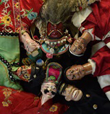 The basic structure of puppets includes frame, clothing and accessories, and cap (headgear). The frame includes the head, cloth body, arms, cloth legs, and shoes. During performances, the puppeteer inserts a hand into the costumed frame of the puppet to manipulate it.
