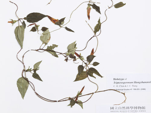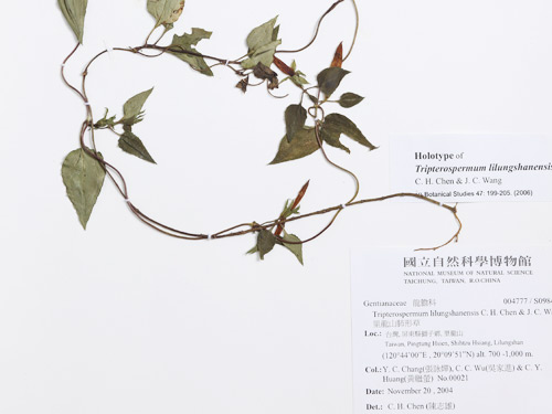 此標本於2004年冬,由張詠嬋等人採自臺灣屏東的里龍山。2006年,陳志雄、王震哲與張詠嬋以此為正模式標本,共同發表為龍膽科的新種。近年來,雖廣泛搜尋,仍然未在其他地方發現,亦即此物種乃屬侷於一處生育地的臺灣原生特稀有種類。其實,本館保存的標本量並不多,相關的標本資料極少,如果唯一的生育地受到人為干擾,將使此一物種陷於萬劫不復的危機中,寶貴的獨特基因庫恐怕就會消失了。