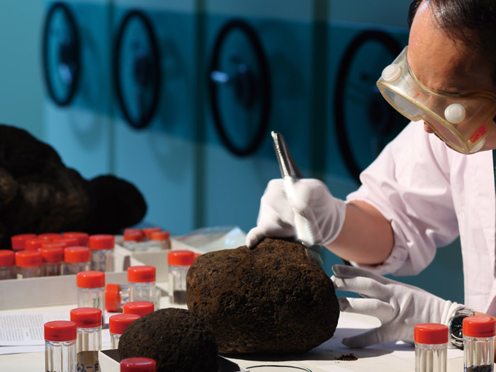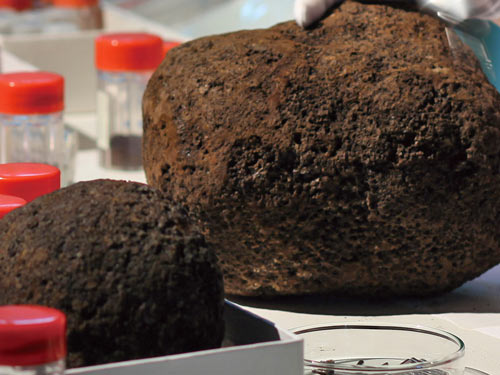錳核因富含錳、鐵、鎳、鈷、銅、鋁、鉬、釩、鈦等金屬元素,而被視為具有經濟潛能的礦產資源。由於錳核位處深海海床,打撈不易,且冶煉仍有困難,所以尚未進行大規模開採。本件標本是在菲律賓海水深 2,900公尺海床上所撈獲,由臺灣大學海洋研究所陳汝勤教授捐贈本館典藏。