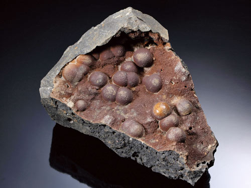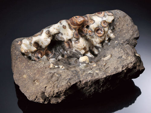澎湖、三峽的文石形成於玄武岩內部的氣孔,主要由方解石、霰石、蛋白石、菱鐵礦等礦物組成。通常由氣孔的四周向內生長,生長的時候,由一個點向外一層一層生長而呈葡萄狀,甚至形成同心圓,俗稱「眼」。
