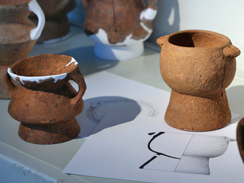 這件雙耳高足豆可能也出自卑南遺址的石板棺中。質地為夾細砂紅陶,容器部分呈缽形,缽口微歛,下有高圈足,缽口旁有兩個帶穿的小耳,或許用來穿繩或安裝提把。在卑南遺址以往的出土品中,沒有見過相同類型的陶器。