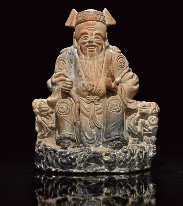 此件為清咸豐年代作品,應該是大陸師傅所製,著員外帽、壽字衣、坐山頭,造型特殊。一般陶燒製品多是模造量產,此件應是手工創作單品。