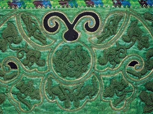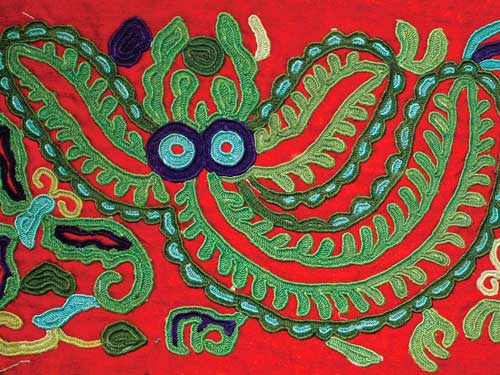 這些繡片都來自黔東南西江的苗族。苗人將神話傳說繡在服飾上面,作為文化的傳承。
