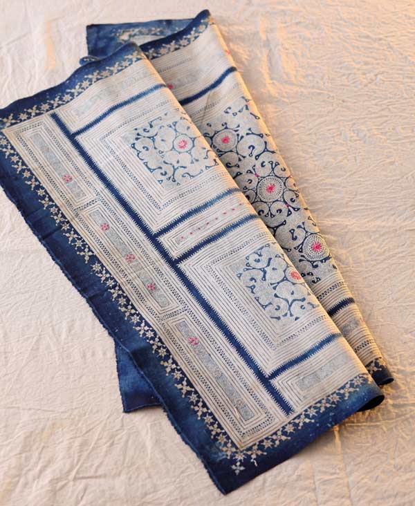 背兒帶古稱「襁褓」,又稱小孩「背帶」、「揹帶」或「背扇」、「揹扇」,用以繫綁和包覆幼兒所使用的寬帶和被子。因為生活艱辛,婦女將孩子背在背上看顧,以免乏人照顧。此件來自盛行蠟染的貴州黃平,蠟染也施用於背兒帶的製作。背兒帶被認為是小孩的「護身物」,婦女將各種趨吉避凶,具有吉祥、幸運的紋飾畫在背兒帶上,祈求小孩健康成長。