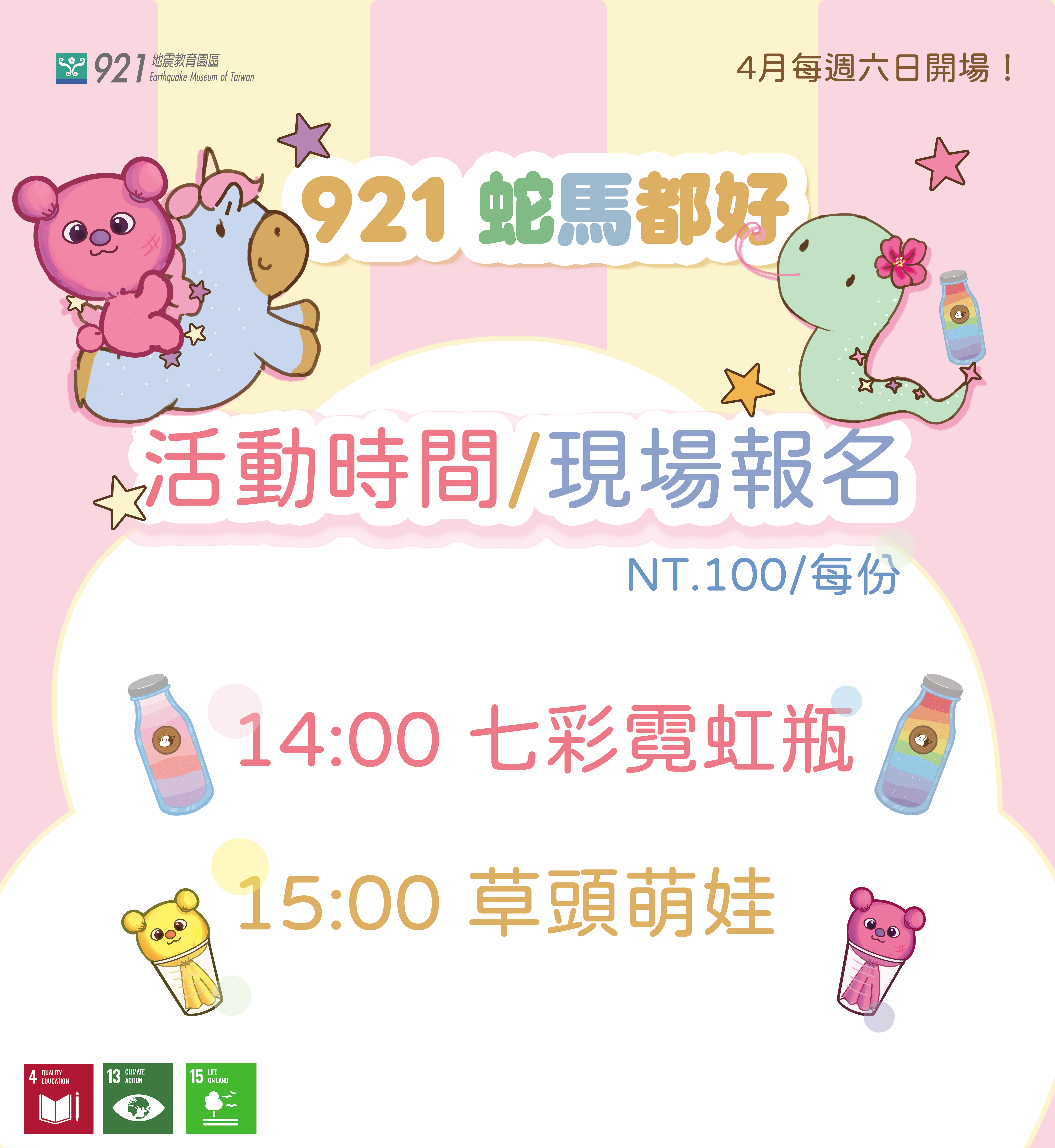 活動日期:4月每周六日活動場次: 14:00 七彩霓虹瓶15:00 草頭萌娃