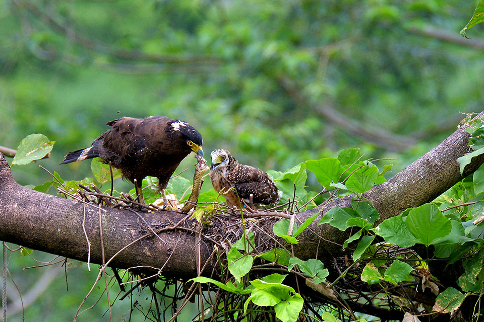 The crested serpent eagle is a medium-sized bird of prey in the family Accipitridae. This bird builds its nest in treetops using tree branches with only one egg produced per clutch. Snakes, lizards, small birds, and rodents are fed to the young. The males obtain food and pass it to the females, which are responsible for feedings. As the juveniles mature, females place the food in the nest for them to eat on their own.